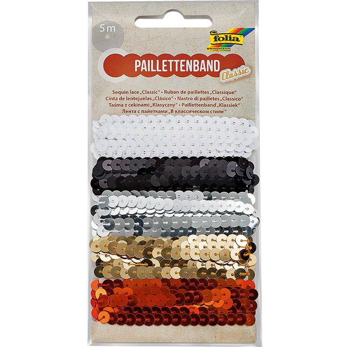 Paljettbånd i 5 forskjellige farger fra Folia. Hver og ett bånde er 1 meter og du får fargene hvit, sort, sølv, gull og kobber.