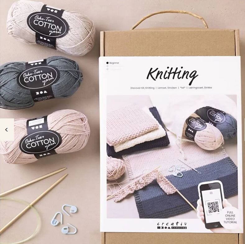 Med dette settet kan du lære å strikke. Inneholder alle materialer og instruksjoner du trenger.