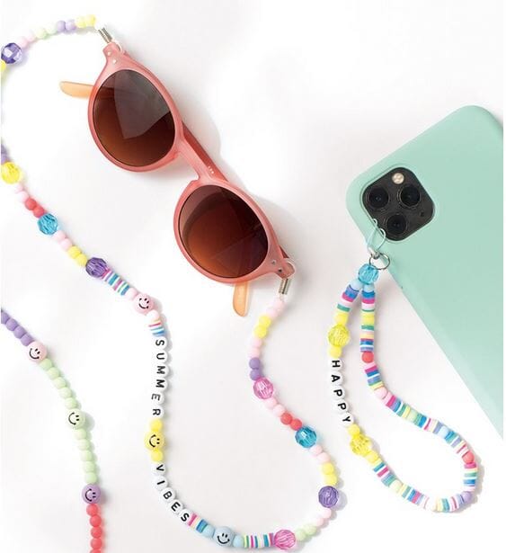 Perlesett med fargerike perler, diskperler og smilies, hvor man enten kan lage brillesnor, mobillenke eller armbånd.