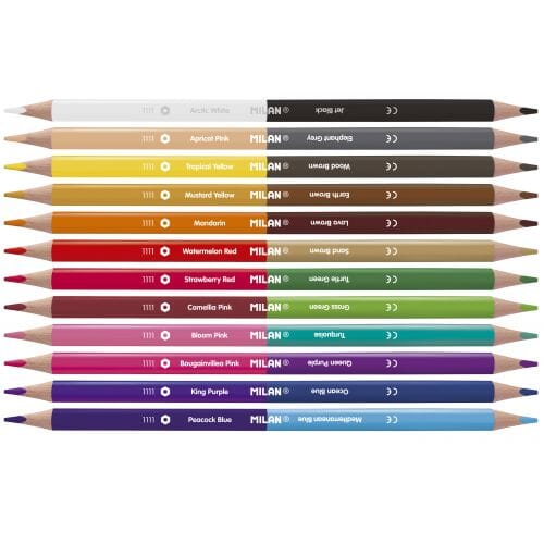 12 trekantede fargeblyanter i tre i en pakke. Hver blyant skifter farge på midten og har en spiss på hver side. Totalt 24 farger. Blyanten er 2,9 mm Ø, og takket være LPS (Lead Protection System) er blyanten motstandsdyktig mot brudd. Treet kommer fra bærekraftige skoger. Hver farge har sitt eget navn, og emballasjen inneholder et innerbrett.