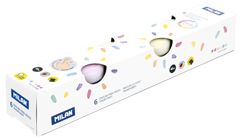 MILAN fingermaling i 6 pastellfarger, 40 ml per boks. Perfekt for å skape fargerik kunst for barn. Pastellfarger: grønn, blå, gul, oransje, rosa og lilla. Fargene kan også blandes for å skape nye farger. Fargene kan enkelt påføres med fingrene, men kan også brukes med pensel, svamp eller stempler. Tørketiden avhenger av fargemengden og kan lett vaskes ut av de fleste tekstiler.