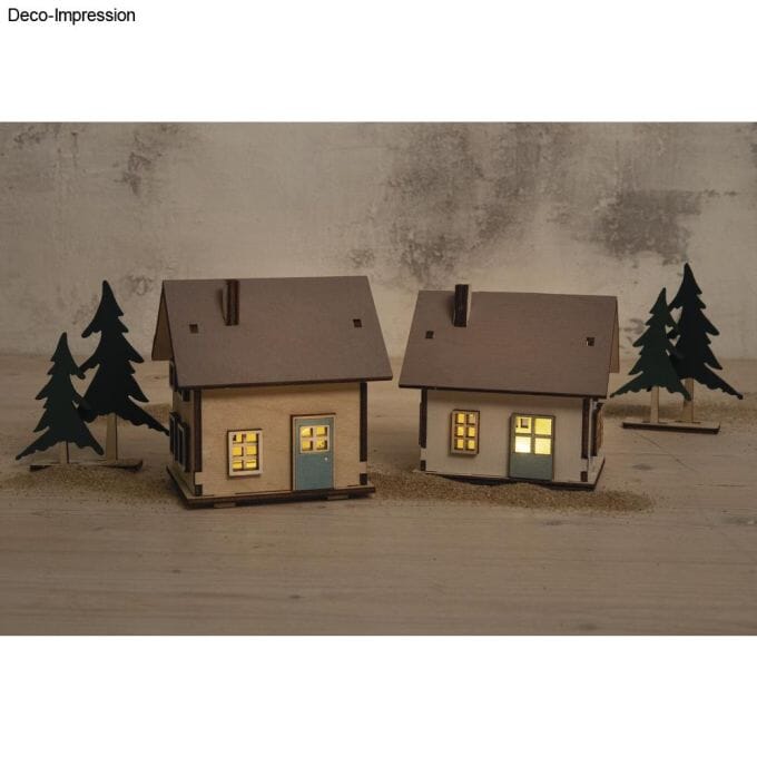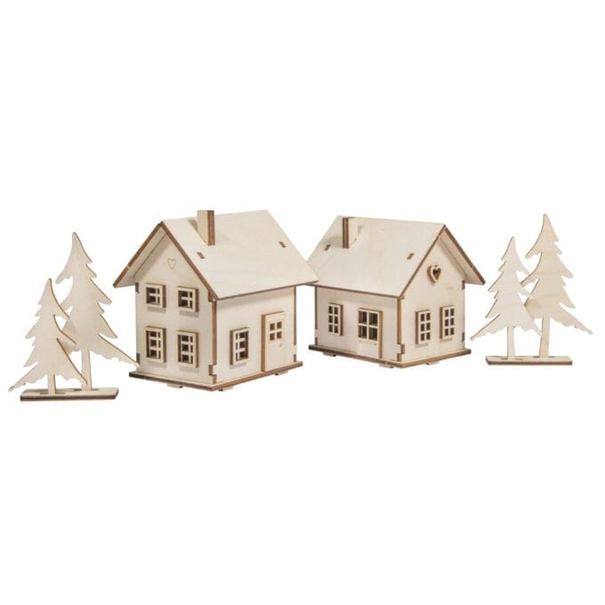 Et nydelig byggesett med detaljerte trehus, små grantrær og LED-lyskjeder som lyser opp husene med en koselig glød. Settet består av to ulike hus, fire grantrær og to LED-lyskjeder (batterier medfølger ikke).