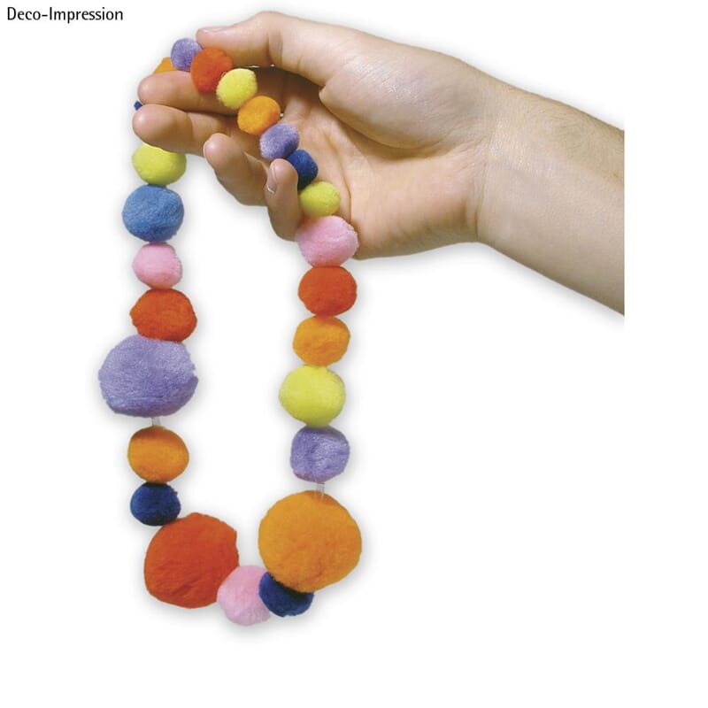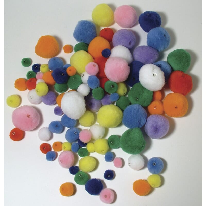 Pompons med plastrør som gir uante muligheter for å lage figurer og fargerike kjeder. I denne pakken er det 4 forskjellige størrelser på pompomsene - 10 mm (rørhull 2 mm) og 15/20/25 mm (rørhull 3 mm). Det er tilsammen 100 pomponger i pakken.
