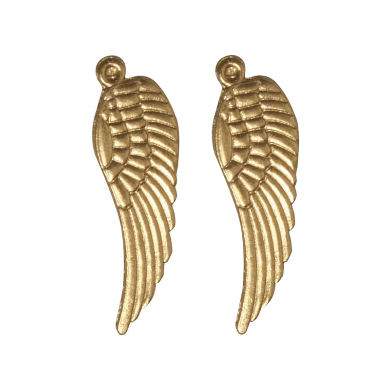 Vinge anheng i gullfarget metall og opphengsring, der høye på vingene er 3 cm. Kanskje best egnet til anheng på kjeder og smykkeanheng, men går an å ha på armbånd også.