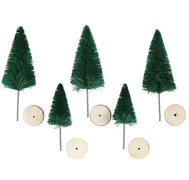 Pakke med små dekorative juletrær til julepynt og juledekorasjoner. Det er 5 stk juletær i 2 størrelser i pakken.