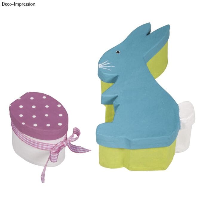 Skap en personlig og stemningsfull påskedekorasjon med dette søte settet med pappmachébokser formet som hare og egg. Perfekt til å male, dekorere og tilpasse akkurat slik du ønsker – enten med maling, bånd, blonder eller små pyntedetaljer.