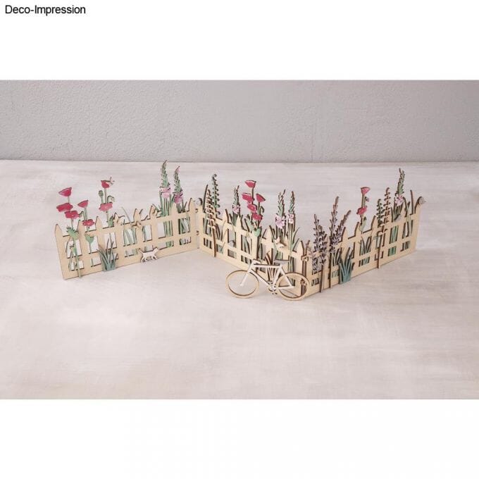 Byggesett landskap med gjerde og blomster som kan settes sammen til en rekke og brukes som den er, eller dekoreres helt etter eget ønske med hobbymaling, akrylmaling og/eller glitter. Enkel å sette sammen, og blir utrolig dekorativ om man har en lyslenge bak (følger ikke med i pakken).