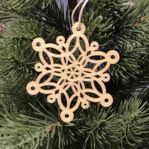Snøfnugg oppheng av lyst tre med mørke kanter til juledekorasjoner og julepynt. Trepynten kan pyntes og males eller brukes som den er, og den har opphengssnor.