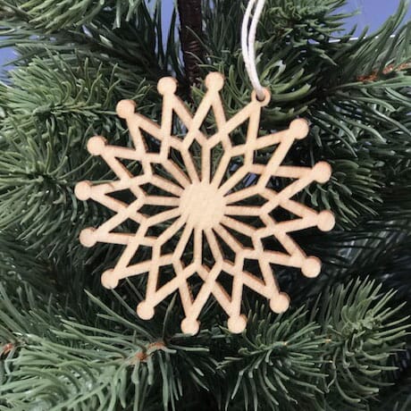 Snøfnugg oppheng av lyst tre med mørke kanter til juledekorasjoner og julepynt. Trepynten kan pyntes og males eller brukes som den er, og den har opphengssnor.