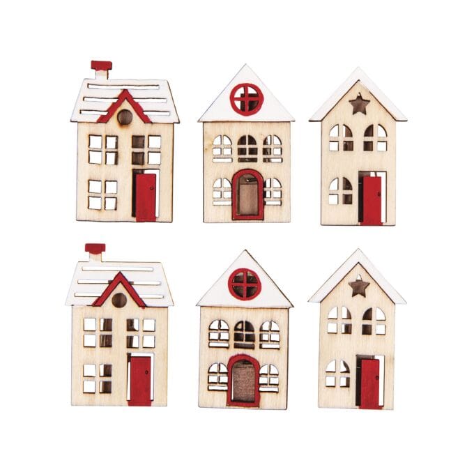 De små trehusene på klyper, malt i klassiske julefarger rød og hvit med en dekorativ brun kant, er en sjarmerende pynt til julegavene dine. De kan brukes til å feste merkelapper eller til å dekorere på mange andre måter. Hvert hus måler omtrent 3 x 4 cm, mens klypene er ca. 0,7 x 3,5 cm. De er laget av poppeltre som er FSC™-sertifisert og stammer fra bærekraftig skogbruk. I pakken får du seks dekorative treklyper med små julehus.