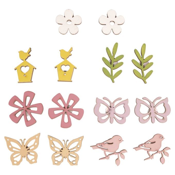 Trepynt i delikate farger som gir deg lyst til å lage vår- og sommerdekorasjoner. De pynter opp kort, gaveinnpakning og mye mer. Med selvklebende limpute. Innhold: 14 fargede trepynt, str 2,6-4,3 cm: 4 blomster, 4 sommerfugler, 2 fugler, 2 fuglehus og 2 grener. Med selvklebende limpute på baksiden for rask festing. Bare trekk av filmen og fest den på.