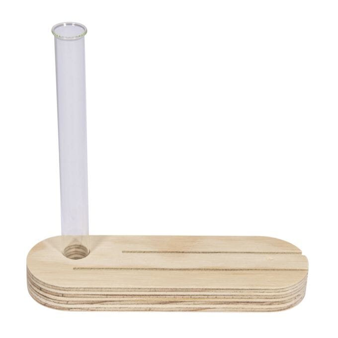 Trefot med holder for reagensrør til f.eks friske blomster, tørkede blomster, o.l. Selve foten er av ubehandlet treverk som kan brukes som den er, lakkes, males eller pyntes med bånd, papir og mye mer. Trefoten har også spor til et bilde, en liten scrappeside eller kort.