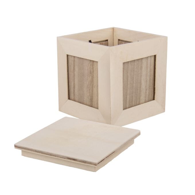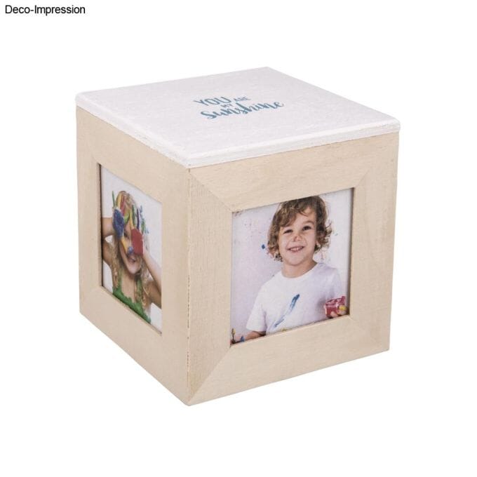 En fantastisk gave til dine kjære i form av en fotogaveeske med lokk. Du kan feste personlige bilder på de 4 sidene av trekassen. Fotostørrelse: ca. 7x7 cm, rammebredde: 2,5 cm Den glatte overflaten på trekassen er ideell for mange måter å pynte den på. Lim med serviettteknikk, rispapir, stoff eller mosaikksteiner, mal f.eks. med shabby chic-teknikk. De kreative mulighetene er allsidige. Boksen er ideell for oppbevaring av minner og smykker. Lokket kan tas av.