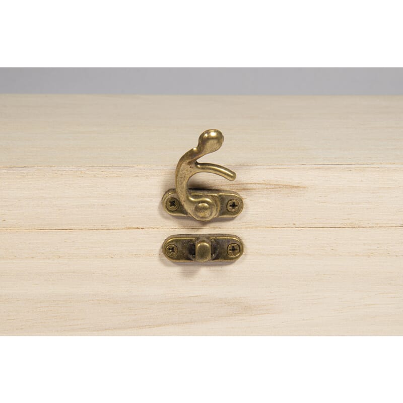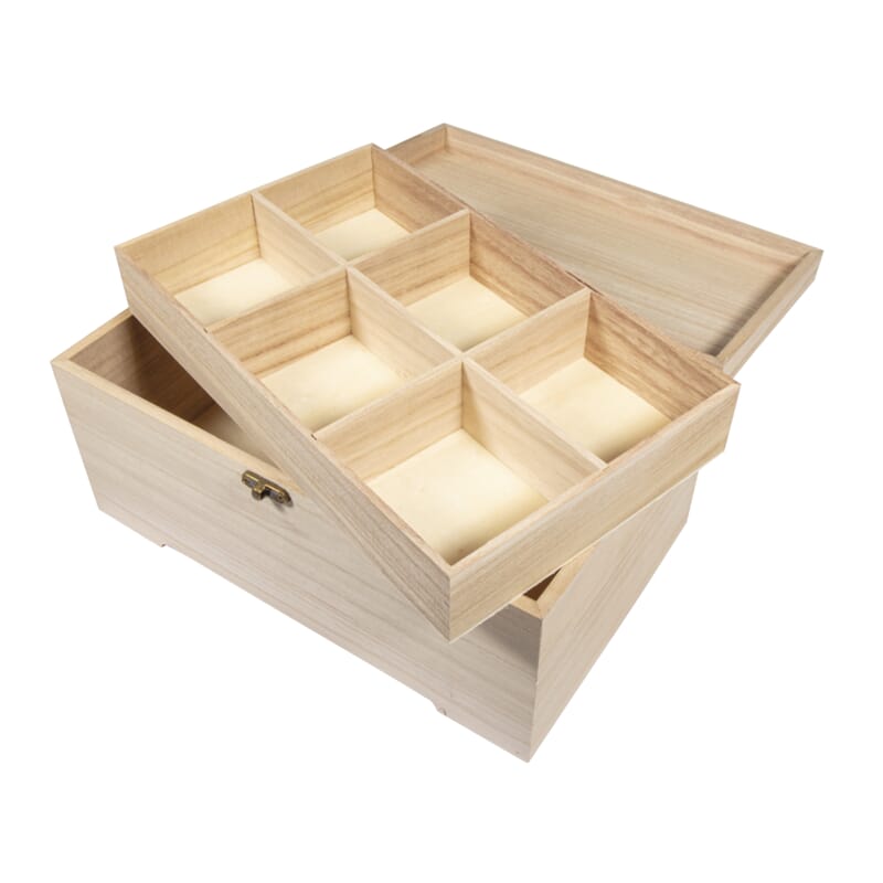 Lekkert boks i ubehandlet treverk som kan males og pyntes på mange måter. Skrinet består av 2 deler, der selve esken er et skrin med lokk og låsemekanisme. Og del nr 2 er et innsett med rom i forskjellige størrelser.