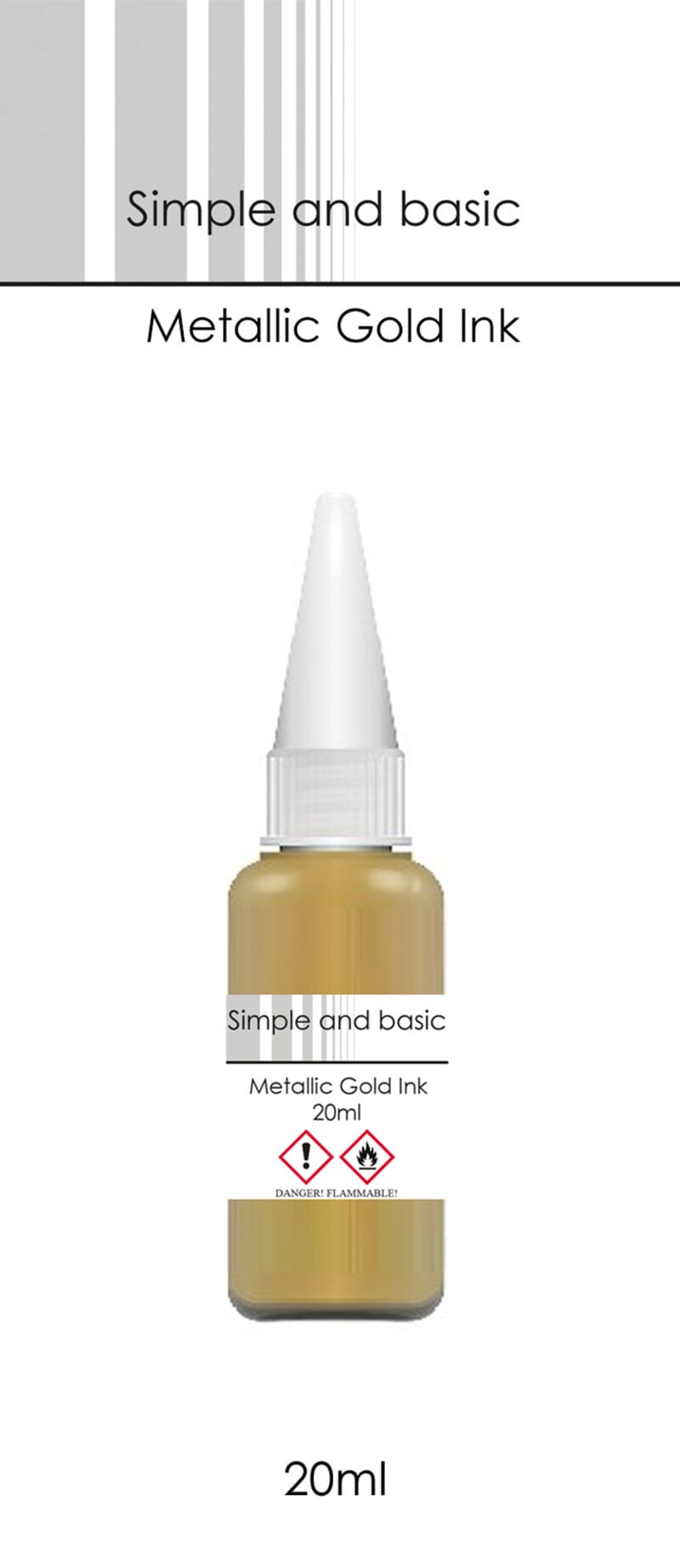 Metallisk blekk fra Simple and Basic som er tørker raskt, syrefri alkohol blekk. Fareidentifikasjon: Meget brannfarlig væske og damp. Gir alvorlig øyeirritasjon. Kan forårsake irritasjon av luftveiene. Dersom det er nødvendig med legehjelp, ha produktets beholder eller etikett for hånden. Oppbevares utilgjengelig for barn. Holdes vekk fra varme/gnister/åpenflamme/ varme overflater. Røyking forbudt. Vask hendene grundig etter bruk. Brukes bare utendørs eller i et godt ventilert område. Bruke vernehansker/verneklær/vernebriller/ansiktsskjerm.