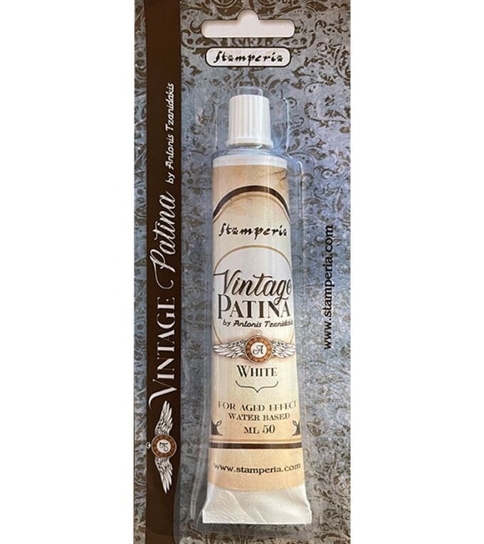 Vintage patina fra Stamperia som gir en rustikk og gammel effekt på prosjektene dine. Denne kan brukes på metall, papir og kortlaging. Malingen har en dekkende farge, og kan dels gnis litt transparent med en babywipe. Malingen er vannbasert! NB! Skru korken varsomt på!