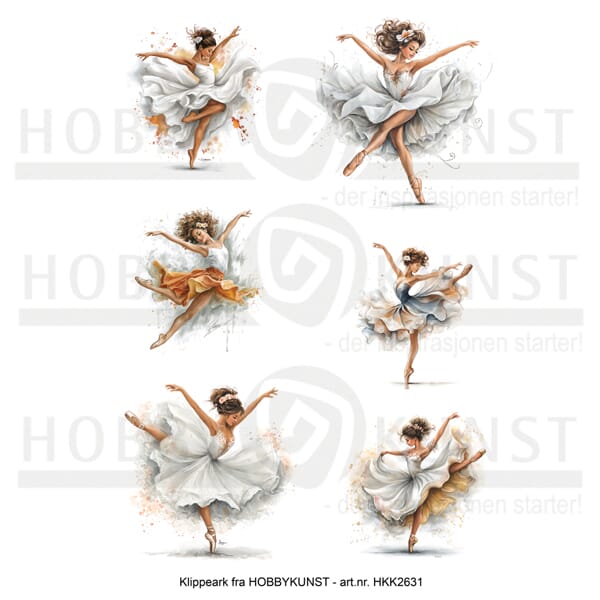 Her får du seks unike motiver av grasiøse dansere i vakre, flytende kjoler – fulle av bevegelse, eleganse og letthet som gir prosjektene dine et eksklusivt preg.