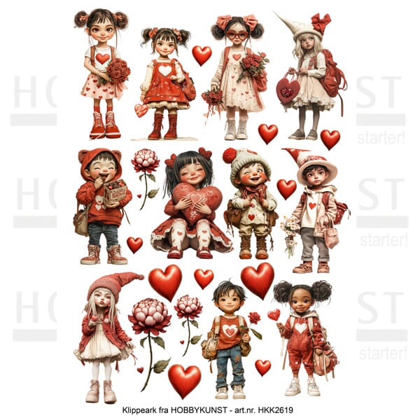 Dette nydelige klippearket fra Hobbykunst er perfekt til Valentinsprosjekter og alt som handler om kjærlighet, varme og små øyeblikk som betyr noe ekstra. Arket er fylt med søte barn i myke røde, rosa og kremfargede toner, kombinert med hjerter, blomster og små detaljer som gir en romantisk og leken helhet.