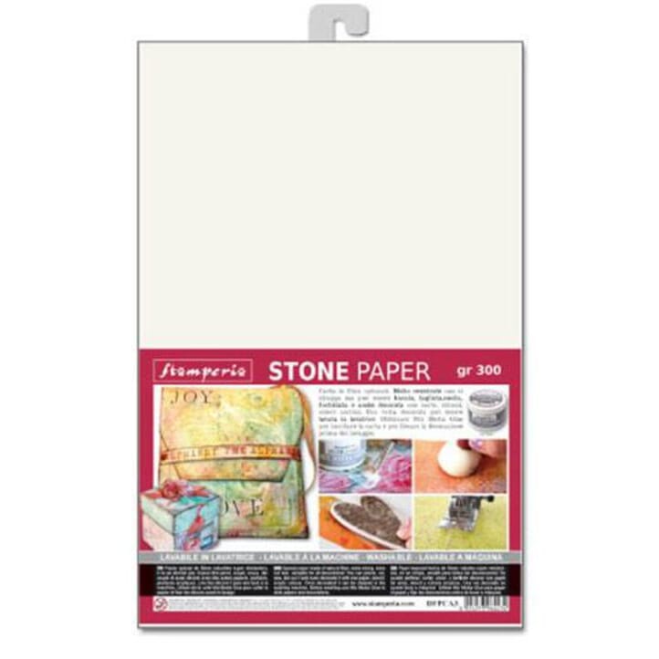 Stone Paper A3. Washable. 29.7x42cm. 300grams. Special paper made of natural fiber, extra strong, does not tear, versatile for all decorations! You can pierce, cut, saw, die-cut it and even decorate it with rice paper, stencil, acrylic colours. Once decorated it can be cleaned in the washing machine. Before washing use mix media glue to stick papers and decorations.