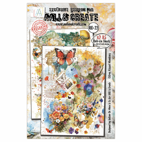 Eksklusive rub-on transfers designet av Autour de Mwa & Co for AALL & Create. Pakken inneholder 2 ark i A5-format samt et brukervennlig verktøy for enkel overføring.