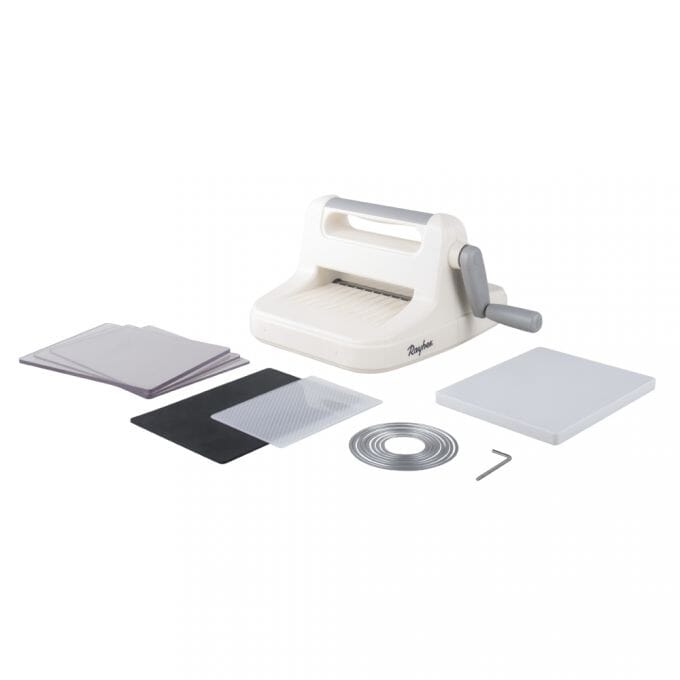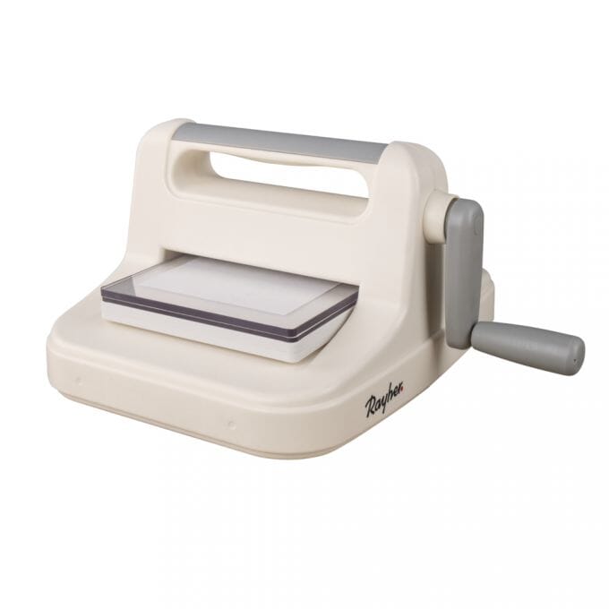 Utstansemaskin fra Rayher med kutteplater i størrelse A5, 15x19,7cm. Selve åpningen på maskinen er 15,8 cm.