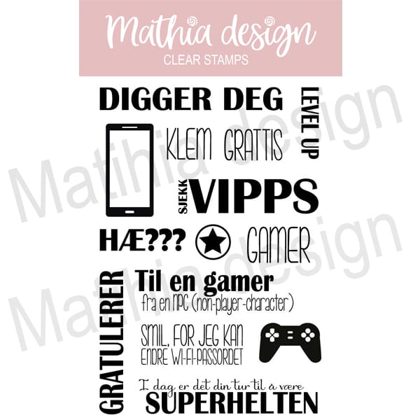 Mathia stempler er norske clearstamps av god kvalitet produsert i Europa med fokus på å ha fleksibilitet med motiv og tekster. Mange av platene inneholder store og små norske tekster som kan settes sammen på ulike måter.