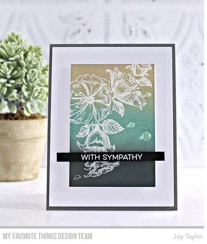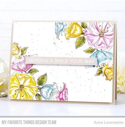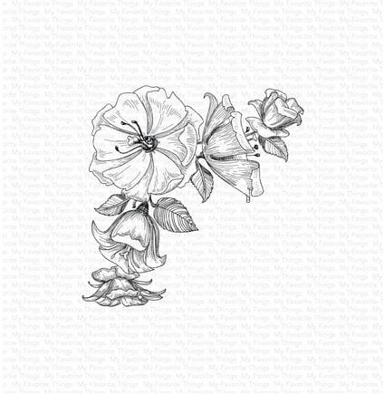 Stempel fra My Favorite Things som enten kan brukes som den er eller embosses og / eller fargelegges. Stempelet er montert på Ez Mount Foam og kan legges direkte på en akrylkloss for bruk sammen med stempelblekk. Anchor the corner of your card front with this stunning design. This assemblage of flowers and foliage will create an elegant feel on your cards and tags. Position the image in opposing corners to fill more of your space while simultaneously framing a central area to spotlight your sentiment.