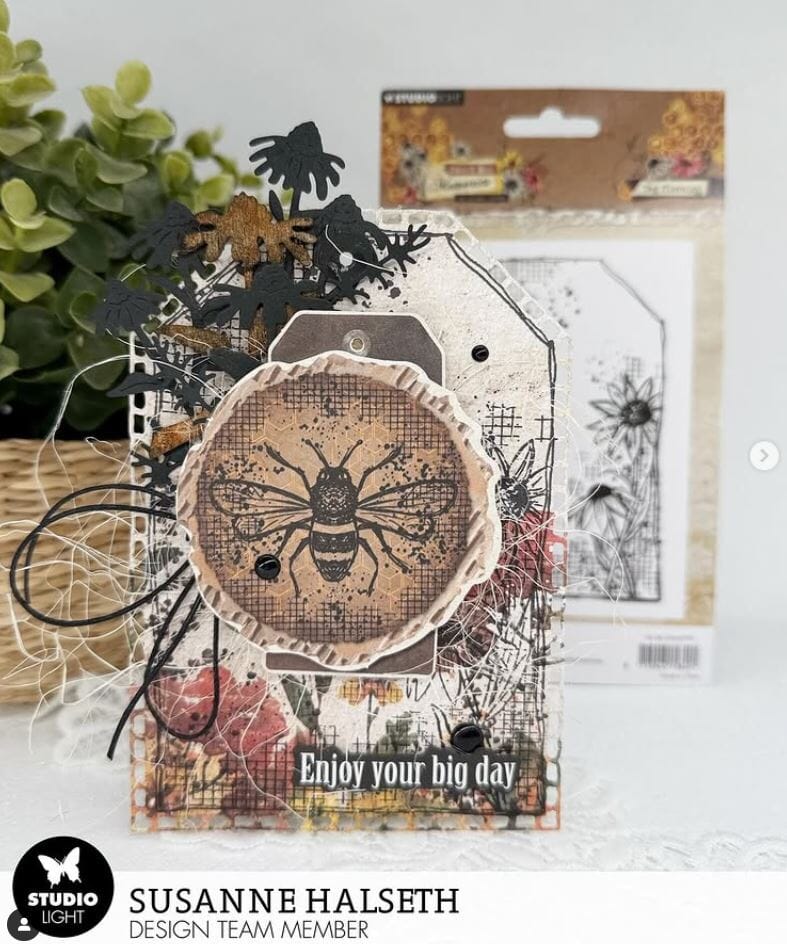 Stempel fra Studio Light som kan legges direkte på en akrylkloss for bruk sammen med stempelblekk. Kjempe fine stempler både for kortlaging, tags, Art journals og liknende papirhobby. Hazel Eaton Collection Sweet Bee Memories by Studio Light. Large bee Clear Stamp. 60x93x3mm. 1 pcs.
