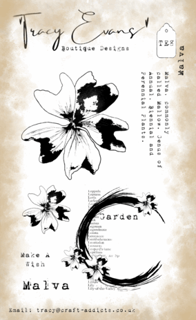 Stempler fra Tracy Evans med for kortlaging, art journaling og andre liknende papirprosjekter. Stemplene fra kan legges på en akrylkloss for direkte bruk med blekkputer.