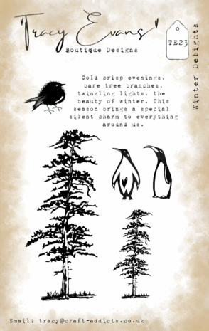 Stempler fra Tracy Evans med for kortlaging, art journaling og andre liknende papirprosjekter. Stemplene fra kan legges på en akrylkloss for direkte bruk med blekkputer.