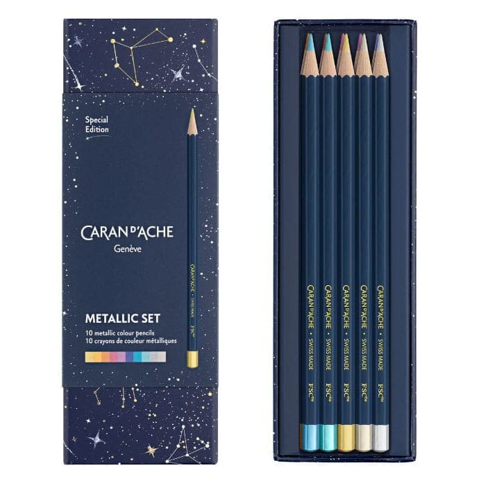 Eksklusivt sett fra Caran d'Ache som inneholder metallik fargerblyanter - permanente farger som vil si at de ikke kan brukes sammen med vann. Flotte metallik farger som gir flott glans. Sedertre hylser med 3 mm bly inni, gode å holde i og myke smidige farger.