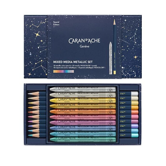 Eksklusivt sett fra Caran d'Ache som inneholder metallik farger - 10 stk Neocolor I og 10 stk fargeblyanter.