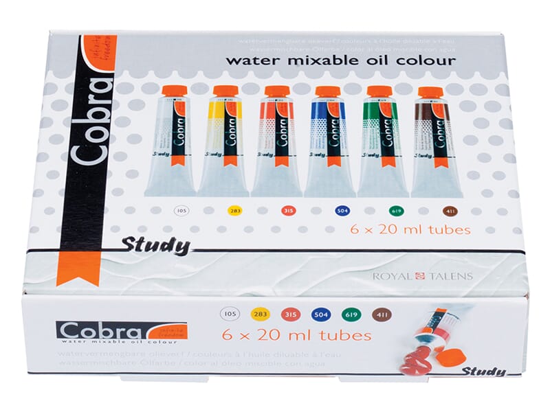 Startersett - Cobra Study er en oljemaling med de samme gode egenskapene som Cobra Artist, i en rimeligere studiokvalitet. Løsemiddelfritt. Man kan bruke vann for å tynne eller vaske bort maling. Allsidig applikasjon - Du kan male som med tradisjonelle oljefarger med laseringsteknikker og vått i vått. Alle fargene i serien har lik tørketid, glans som en ordinær oljemaling og smøraktig konsistens hvor penselstrøkene vises. Vannløselig ojemaling er tilsatt en emulgator som gjør at vann og olje bindes. Man får et mer miljøvennlig produkt med like egenskaper som tradisjonell oljemaling, laget med samme type pigment og olje. Dette gjør den veldig godt egnet for skoler/kurs og for de som vil bruke malingen i hus uten god luftemulighet.