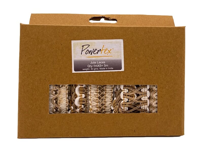 Dekorativ juteblonde / bånd i forskjellig design, og som er kjempe fin å bruke som struktur under maling og medium eller som en helt vanlig blonde på et hobbyprosjekt eller i papirhobby. 5 design i pakken, 1 meter av hvert design.