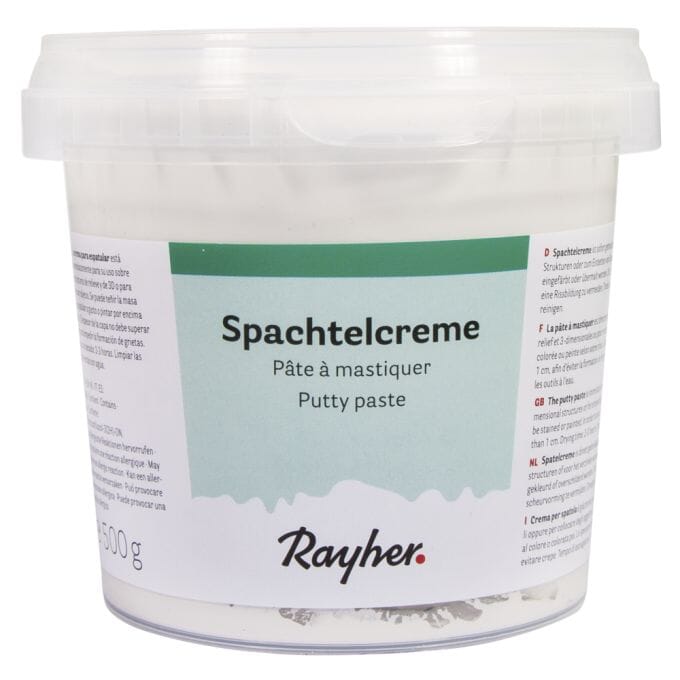 Vår unike spatulakrem er klar til bruk og passer til nesten alle typer maling og design – enten det er for å lage spesialeffekter og overflater eller til akrylmaling. Den kan farges etter ønske og overmales med hvilken som helst lakk. Den er ideell for å lage forskjellige dybder, strukturer, relieffer og overflater når du designer dekorasjoner, gjenstander og figurer. Strukturpastaen har en tørketid på 2-3 timer. Vi anbefaler å unngå en lagtykkelse på mer enn 1 cm.