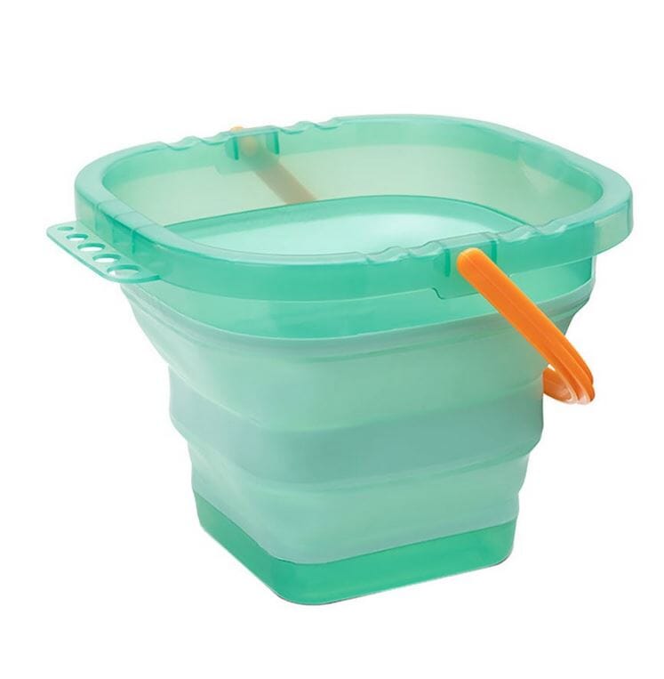 Bøtten åpnes til en stabil vannbeholder og foldes flatt når den ikke er i bruk, noe som gjør den enkel å oppbevare og ta med seg. Den riflede bunnen hjelper til med å løsne maling fra busten uten å skade penslene, mens spor langs kanten holder penslene på plass og hindrer at de ruller av bordet.