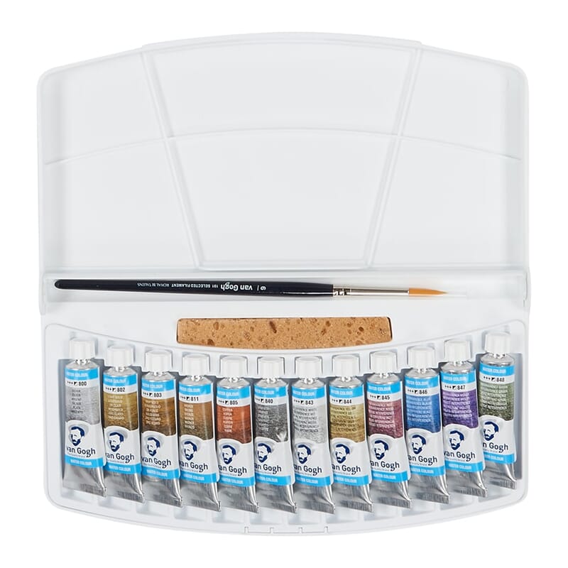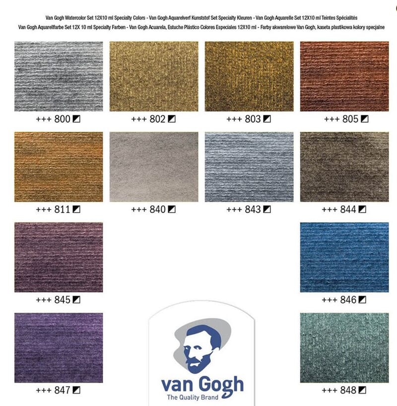 Van Gogh akvarellmaling er et kvalitetssett utviklet for både studenter og kunstnere. Fargene er klare, transparente og intense, med høy fargestyrke som gir levende og rene resultater. Den jevne konsistensen gjør malingen lett å arbeide med, og fargene er enkle å blande for å skape nye nyanser og effekter.