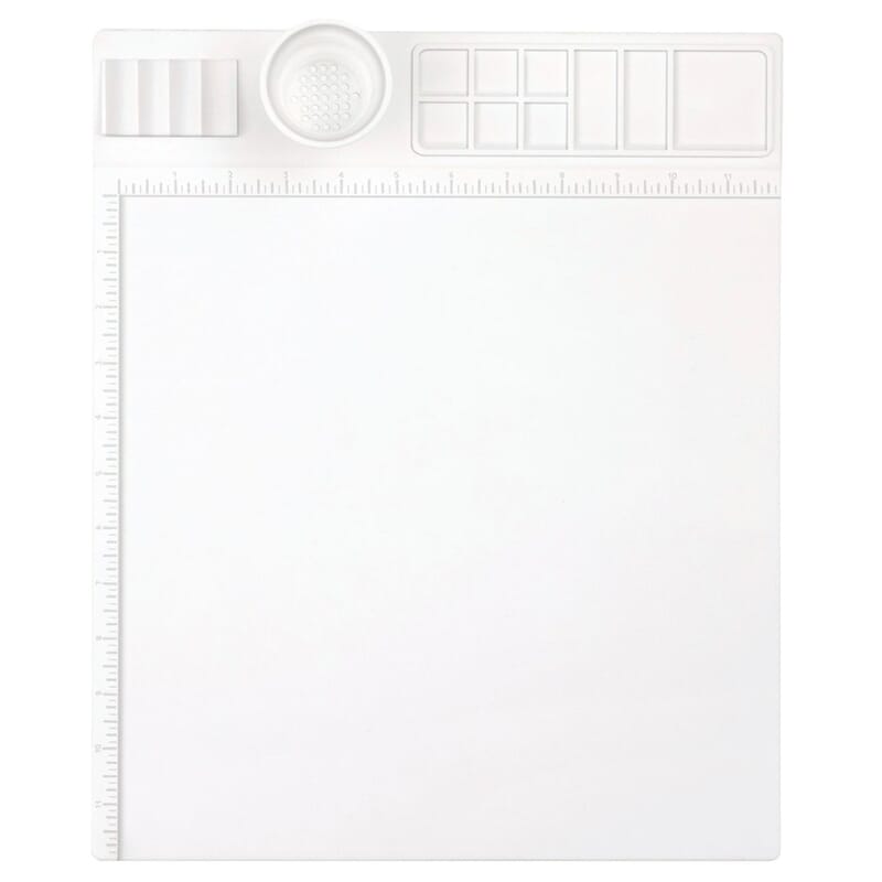 Underlagsmatte fra We R Memory Keepers for akvarellmaling og blekk / maling med blandepalett. Matten er helt genial til blending teknikker med distress, fargelegging og bakgrunnsteknikker. Underlaget har stor arbeidsflate på 12x12 inch, blandingspalett, vannkopp og riller for tørking og oppbevaring for pensler.