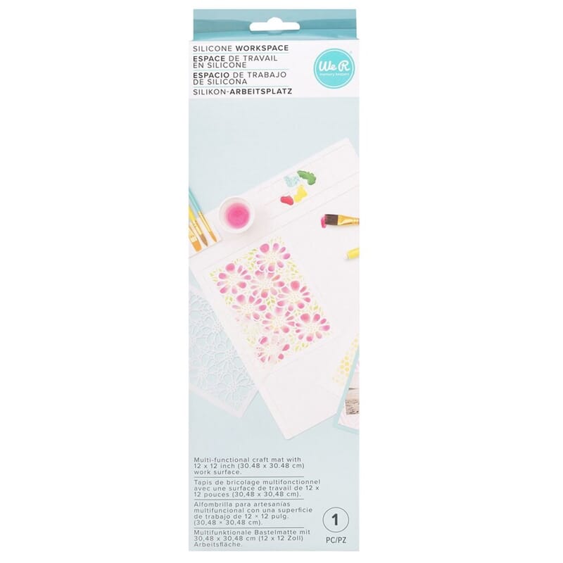 Save your workspace with this silicone mat from We R Memory Keepers! This multi-function Silicone Workspace craft mat is non-stick, waterproof, and heat-resistant. Its uniquely recessed work area measures approximately 12x12 inches, so it can be used for projects large and small. Or try it for multiple applications and mediums, including painting, clay modeling, and epoxy resin. It also features nine reservoirs that can be use for paints or accessories when crafting. The Silicone Workspace also comes with a collapsible brush cleaning cup that doubles as a water cup while painting or a tool holder, so you'll have everything right by your side. Get creative and get crafting with the Silicone Workspace! This package includes one silicone workspace and one stencil mat.