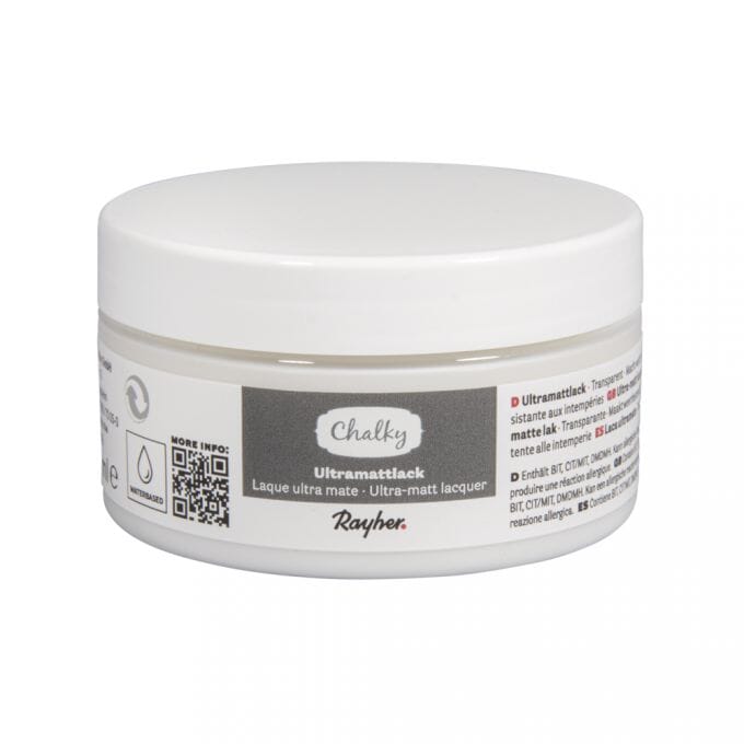 Ultramatt lakk til Chalky Finish maling og liknende maling for forsegling av overfalten. Lakken vil beholde den utlramatte utseende på overflaten. Kan brukes på alt fra treverk, betong, gips, papir, pappmache, lerret, terracotta, isopor og stein.