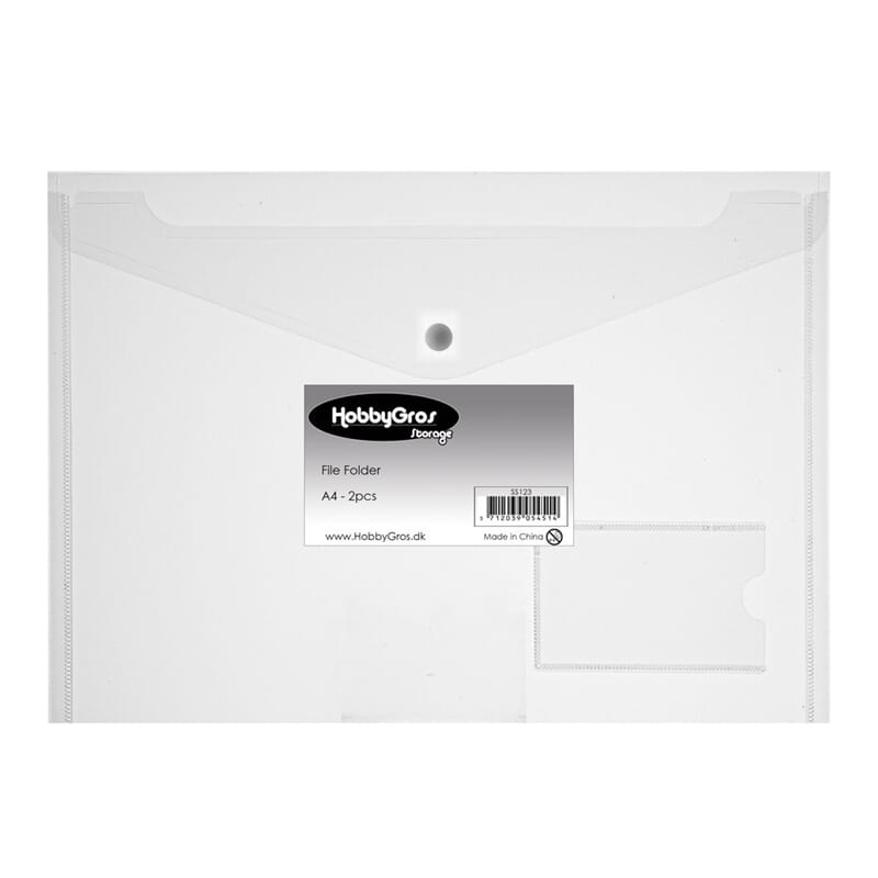 Oppbevaringsmapper av plast fra HobbyGros i størrelse A4. Det er 2 mapper i pakken.