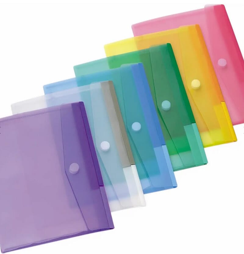 Plastmappe / oppbevaring for klistremerker, restepapir, klippeark og liknende. Selve mappen er er transparent eller farget transparent.