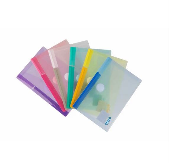 Plastmappe / oppbevaring for klistremerker, restepapir, klippeark og liknende. Selve mappen er er transparent eller farget transparent.