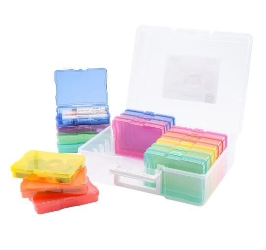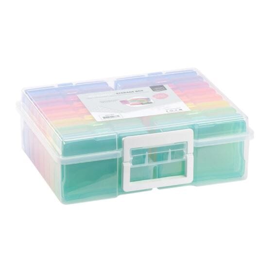 Praktisk oppbevaring fra We R Memory Keepers for foto og journalkort, eller til noe helt annet du ønsker å ha system på. Den store esken er 38.1x30.5x12.7 cm, og de små er 17.1x11.43x2.9 cm (16 stk). This case is perfect for storing cards, craft paper, photos and more! This package contains one 15x11.75x5 inch plastic storage case with 16 6.75x4.5x1.125 inch mini storage cases in assorted colors.