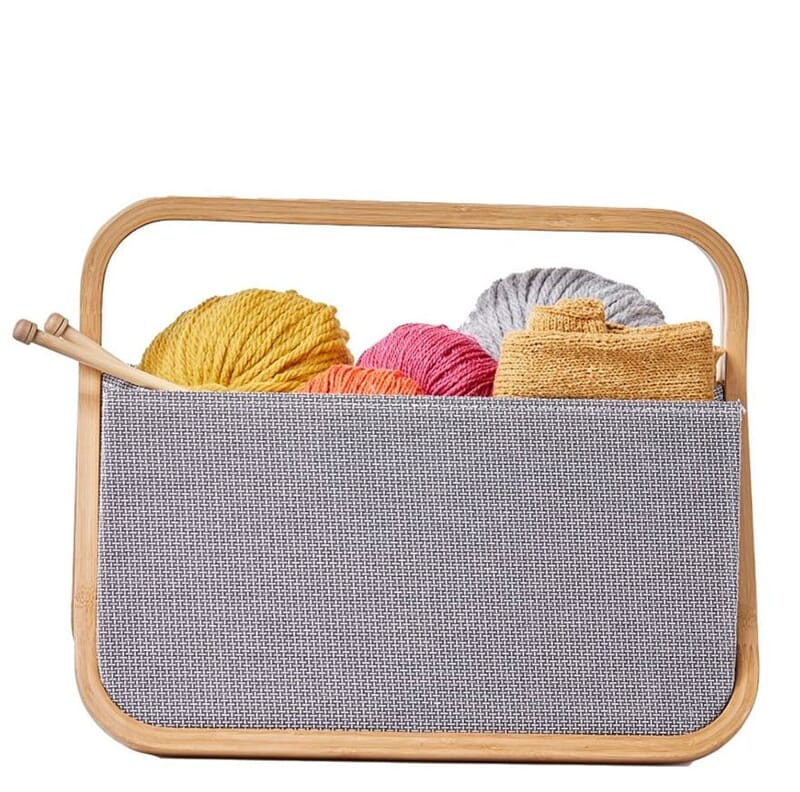 Praktisk oppbevaringskurv i canvas med håndtak i bambus. Kurven gir god plass til strikke- og hekleprosjekter, garn, syutstyr eller magasiner. Den sammenleggbare konstruksjonen gjør den enkel å slå sammen når den ikke er i bruk, samtidig som forsterkede sider og bunn gir stabil oppbevaring. Den nøytrale antrasittfargen og materialkombinasjonen av canvas og bambus gir et naturlig uttrykk som passer godt i interiøret. Leveres uten innhold.