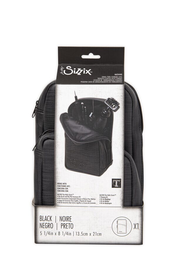 Oppbevaringsveske for verktøy og liknende fra Tim Holtz og Sizzix. This stylish Small Tool Storage Case by Tim Holtz has a sleek black design and is perfect for storing all of your tools in a neat and tidy zip pocket. Designed by Tim Holtz, this storage case has reinforced stitching and a wipeable surface, perfect for tidying away all of your much-loved crafting tools. This sylish, black storage case includes one large zip pocket and one small zip pocket for separate storage of smaller and larger tools. Please note, this is a Storage Case only, it works perfectly with the Tim Holtz Black Shaping Kit (665304), the Tim Holtz Die Brush and Die Pick (665303) and the Tim Holtz Mini Tool Set (664236). Design Dimensions: 5 1/4 x 8 1/4 x 3 1/8 inch. Construction: PU Leather - PVC(40%) Plasticizer (30%) Filler(28%) Base cloth(2%), Lining - 210D 100% Polyester, Webbing - 100% Polypropylene fiber, Zipper 100% Nylon.