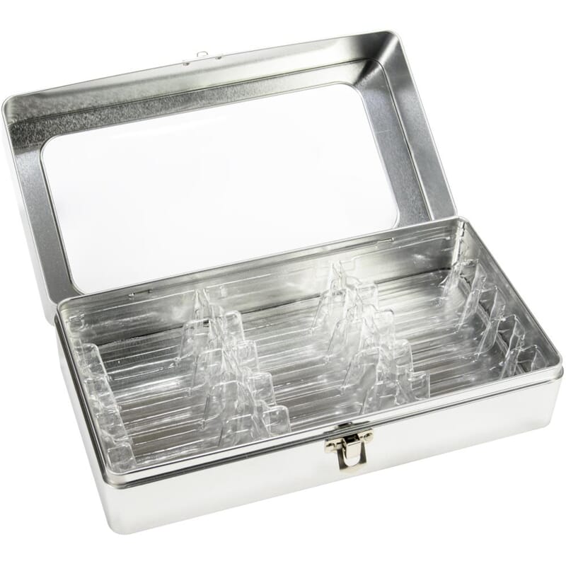 The ideal storage for Tim Holtz Distress Ink Pads and Distress Oxide Ink Pads (sold separately). Organize and transport ink pads easily in this convenient tin. Features a clear window and hinged metal closure. This package contains one 9.75x5x3.25 inch tin that holds15 3x3 inch ink pads.
