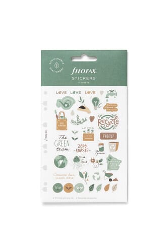 Planner og almanakk klistremerker fra Filofax og planner. I pakken er det 6 ark av 3 design med fokus på et grønnere valg og planlegging. Nydelige duse jordfarger og klistremerke arkene kan settes inn i planneren.
