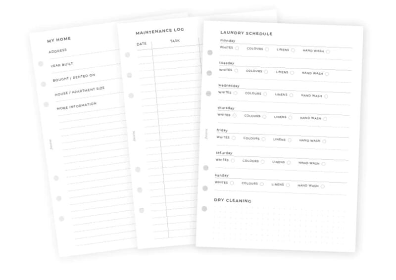 Innsett til planner fra Filofax som gjør at du kan planlegge og organisere husarbeid gjennom uka. Det er forskjellige layouts med forskjellige tema i pakken. Innsettene kan brukes i standard 6-rings planner og Filofax i A5-størrelse.