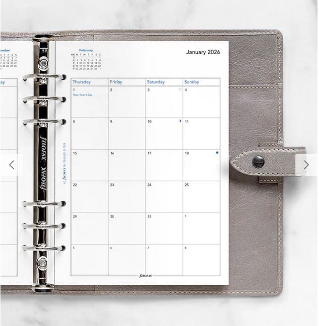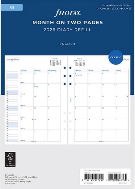 Hold oversikt over livet ditt én måned av gangen med denne A5-refillen som viser en måned fordelt på to sider. Refillen er på engelsk og trykket på 80 gsm papir som er vennlig for fyllepenner. Den passer perfekt til Filofax A5 Organisers og Clipbook.